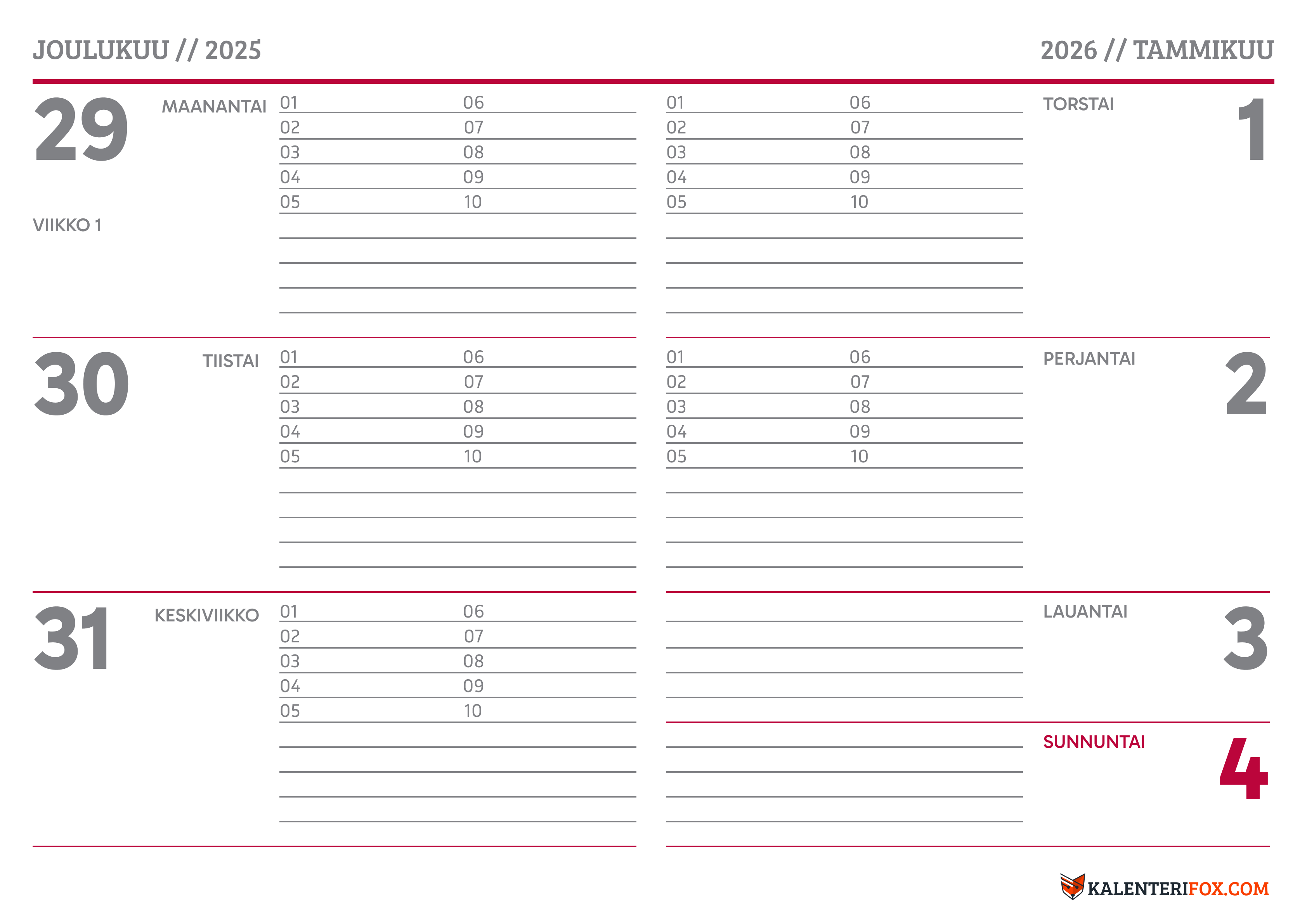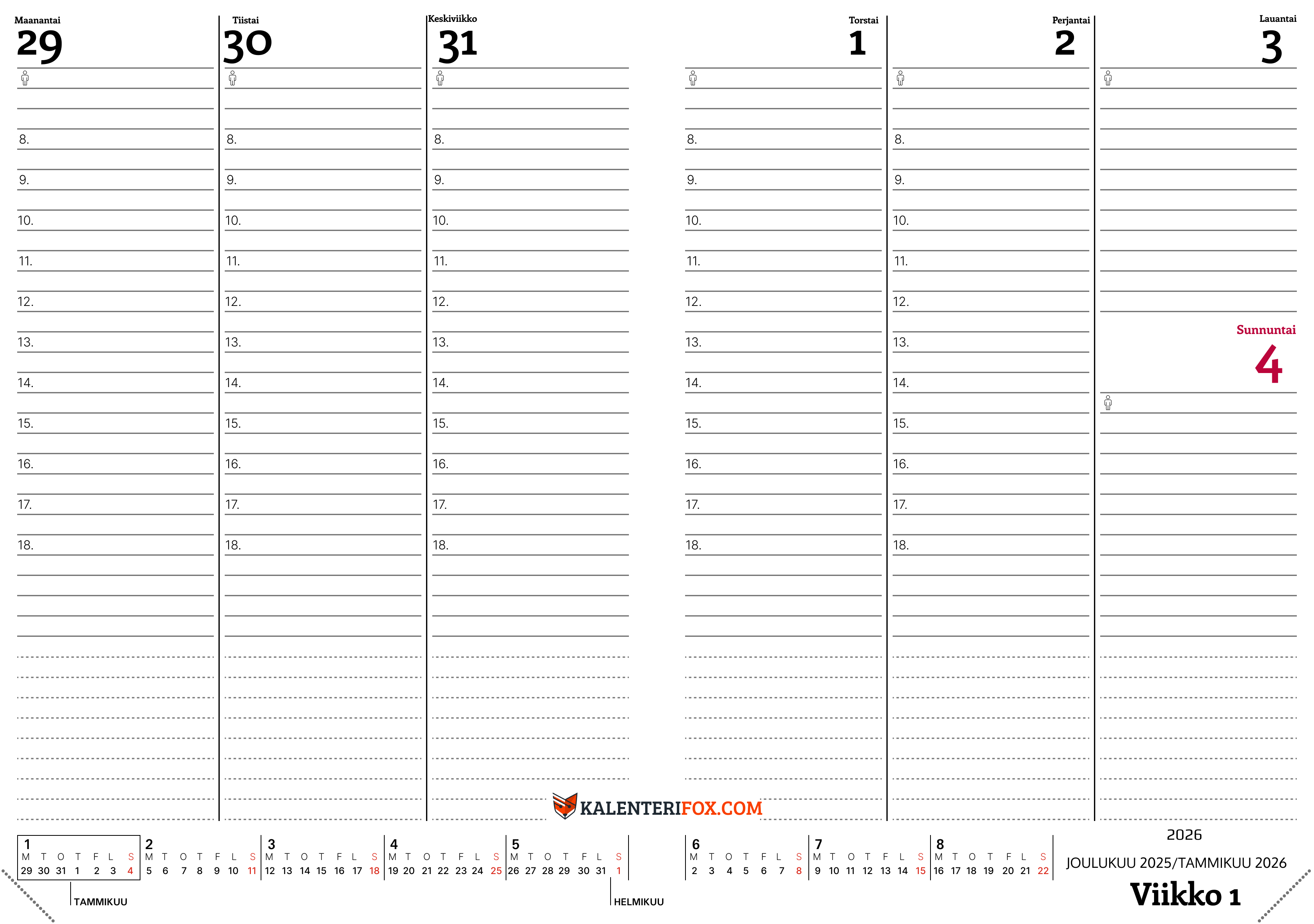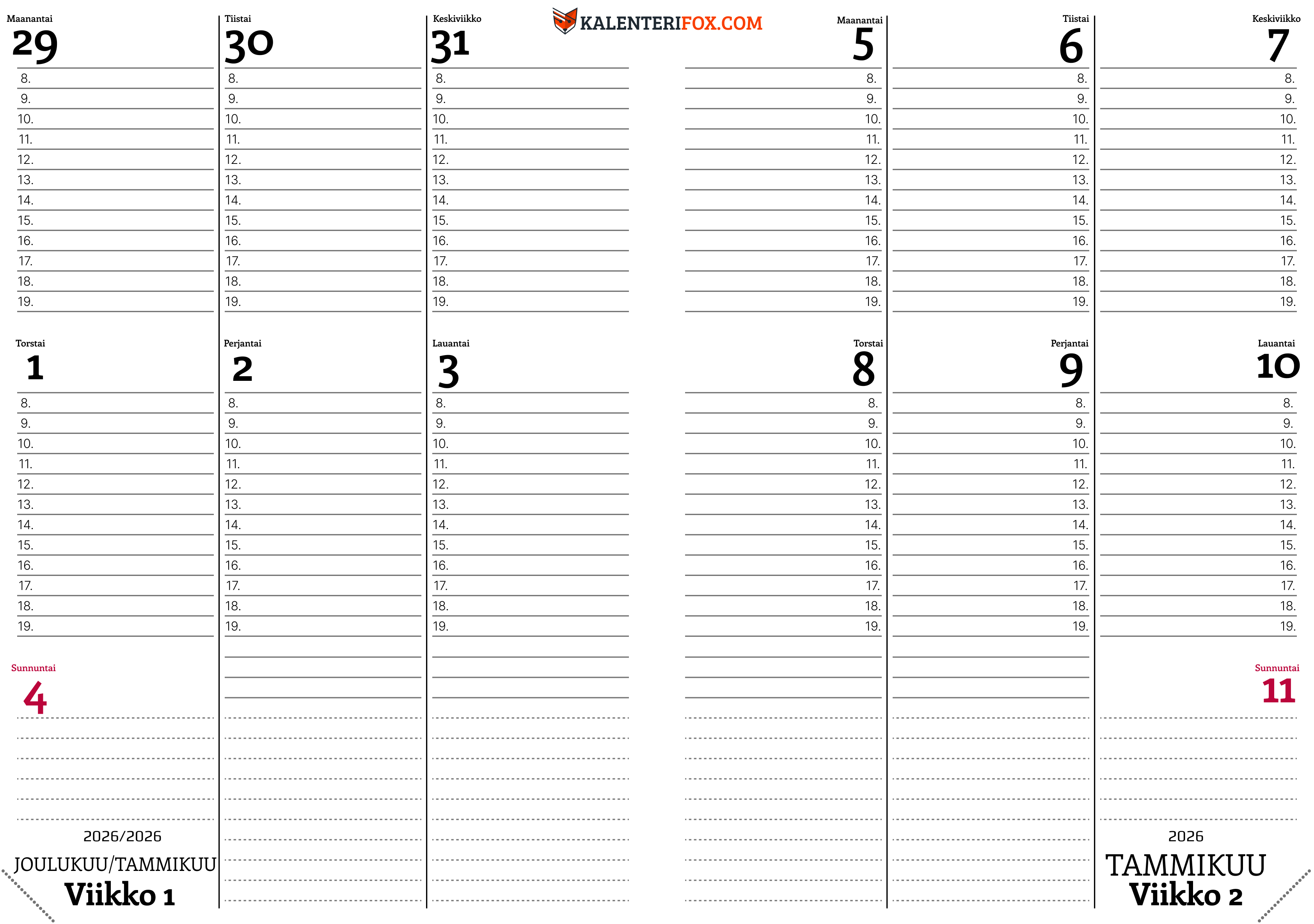 Jokainen malli näyttää kaikki 365 päivää ja 53 viikkoa, ajanjakson torstaista 1. tammikuuta torstaihin 31. joulukuuta 2026. Valitse minimalistinen, esteettinen tai värikäs malli ja aloita vuoden suunnittelu selkeämmin ja tuottavammin.