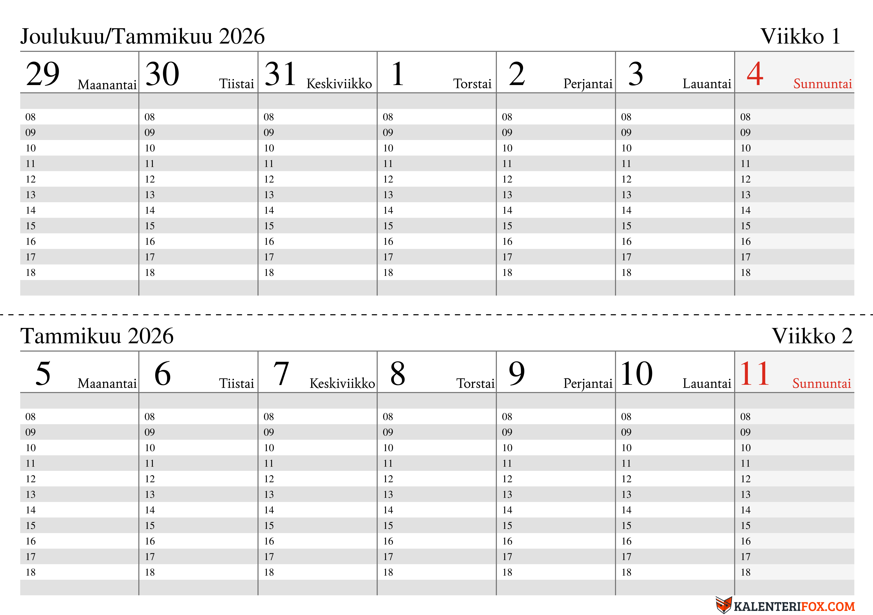Tervetuloa kalenterifox.com-sivustolle, Suomen ykkösalustalle ilmaisille tulostettaville kalentereille. Tutustu yli 750 vuosi-, kuukausi- ja viikkokalenterin valikoimaan PDF- ja PNG-muodoissa.
